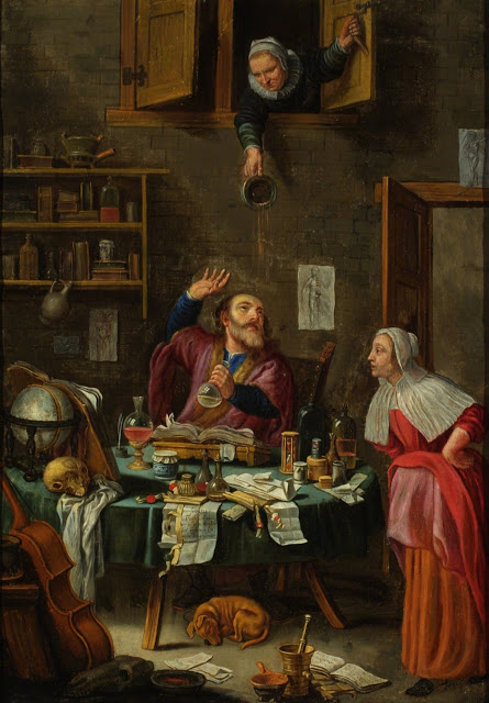 Although the title suggests this is an image of an alchemist, the scene is one of a physician conducting a uroscopy for a female patient. The confusion may be due to the similarity in objects used in both relative practices. These include a mortar and pestle, a variety of flasks and containers, a human skull, an hourglass, a celestial globe, and books. The overt hilarity of the old woman deliberately emptying her piss pot on the physician’s head would have been instantly appreciated by any contemporary viewer of this work. Musical motifs, such as the cello in this painting, were traditionally a symbol of love and warning about sexual promiscuity. The poem on the table, attributed to Socrates, implies that the furious woman above is like Xanthippe, the Greek philosopher’s famously shrewish wife. It reads: I knew well woman, it’s no wonder, it would rain, after this thunder.